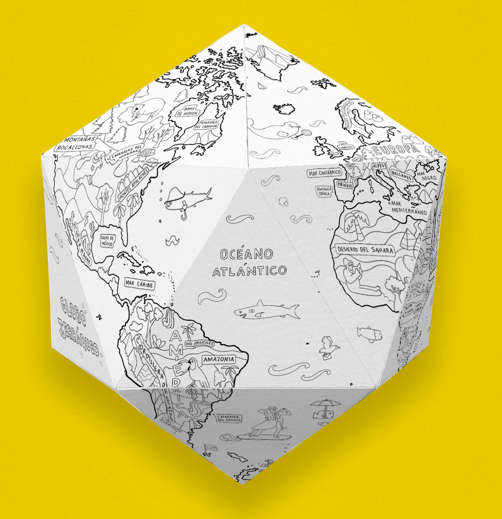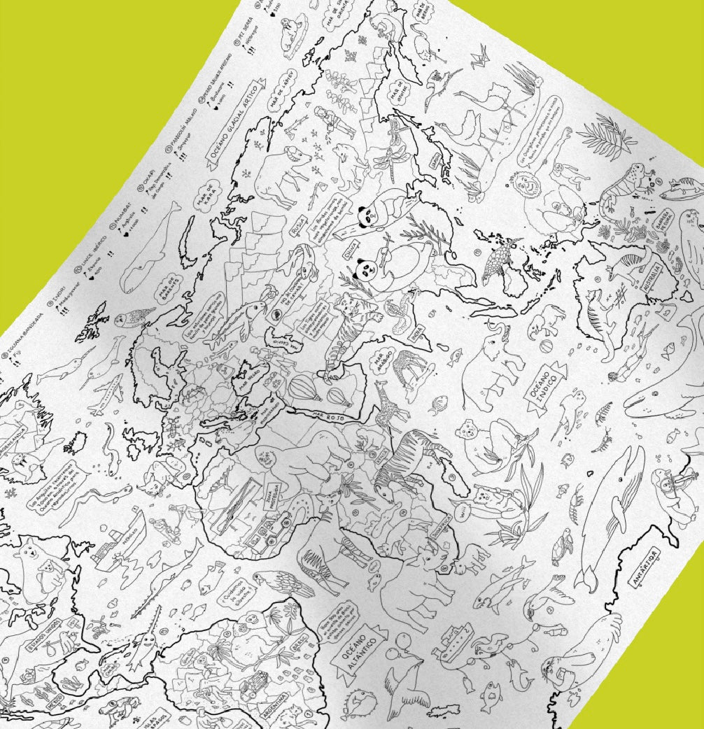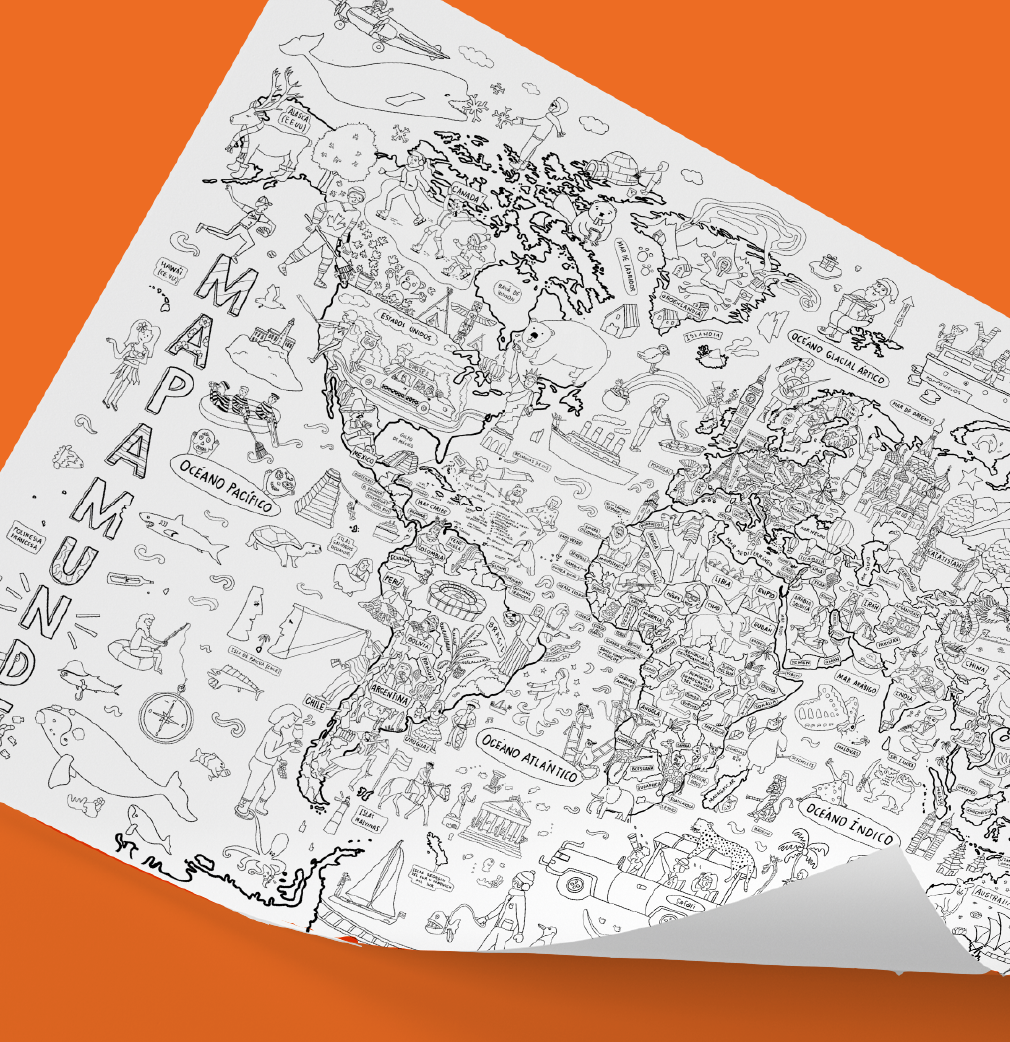 Atlantis es una lámina gigante en blanco y negro para colorear llena de contenido. Una invitación a desconectarnos un rato de las pantallas, reunir a la familia y los amigos alrededor del mapa, y sentarnos en el suelo a conversar, aprender, colorear y viajar con la imaginación.
