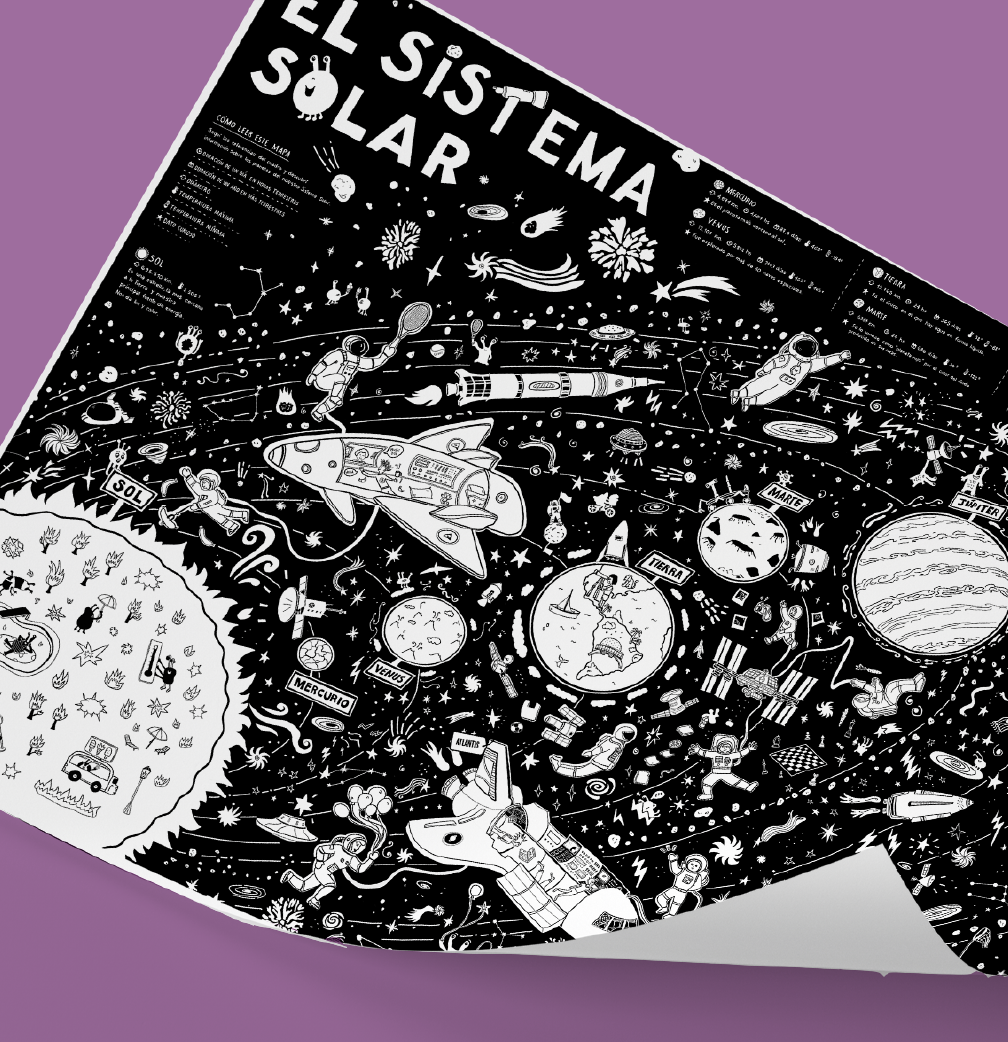 El Proyecto Sistema Solar es una lámina gigante en blanco y negro para colorear, con todos los planetas e información de cada uno de ellos en un viaje intergaláctico de color y diversión!